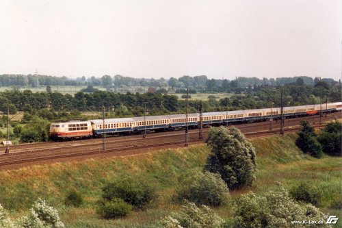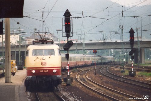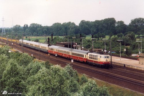 Zum Schluß noch der IC 575 mit der 103 200. Da für dne Einsatz auf der Neubaustrecke viele Bpmz-Wagen benötigt wurden, kamen in den übrigen IC-Zügen seit dme Fahrplanwechsel 1988 nun vermehrt Bm235 zum Einsatz:
