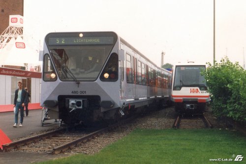 In Hamburg besuchte ich am 10. Juni 1988 die IVA. U.a. wurde dort ein neuer Triebwagen für die Berliner S-Bahn vorgestellt in einem neuen für die Berliner S-Bahn untypischen Farbschema, das sich aber nicht durchsetzte. Die Wiedervereinigung stand zu dieser Zeit noch mehr als in den Sternen. Rechts neben der S-Bahn ein neuer Triebwagen für die Hamburger U-Bahn.