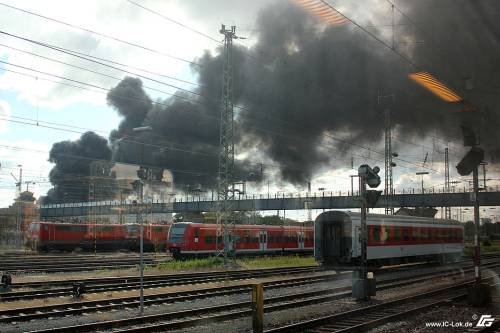 Als heute mit dem IC 2217 unterwegs war, wurde ich Zeuge von dem Brand in einer Styropor-Fabrik in Ludwigshafen. Die Rauchsäule war kilometerweit zu sehen, hier ein Foto, als der Zug noch nördlich von Worms war: