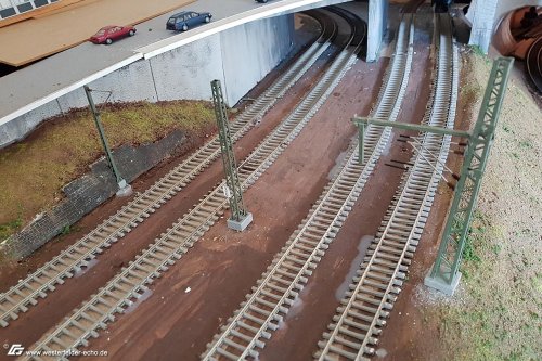 Ansonsten wurden die Oberleitungsmasten in der Bahnhofsausfahrt etwqas umgesetzt, eigentlich sollte der Rohrausleger in die Mitte, aber wenn später mal die Oberleitung kommt, die eine funktionslose reine Selbstbau-Oberleitung wird, ist es besser, wenn die Ausleger an dieser Stelle möglichst auf Zug belastet werden. Einige Ausleger fehlen noch.